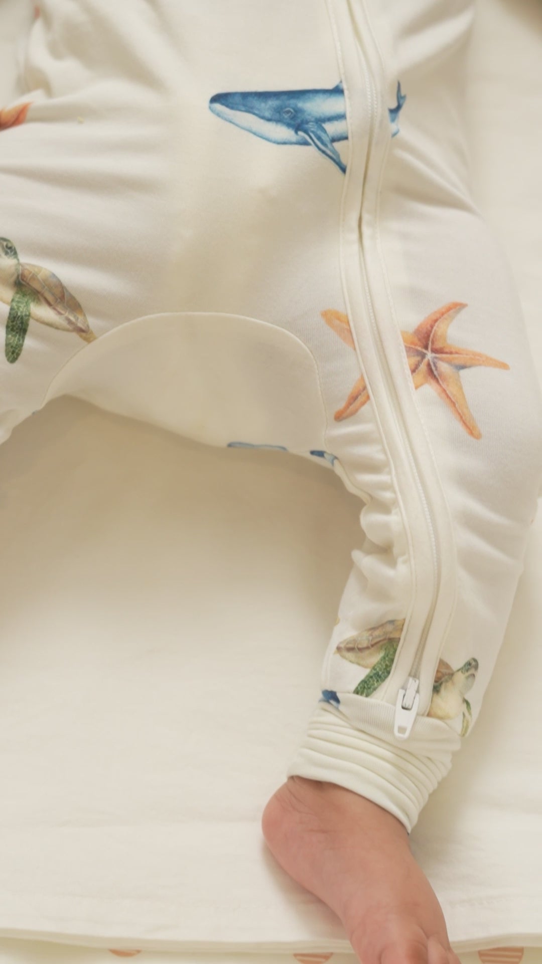 Baby sleeping in a crib with a under the sea zipsuit outfit